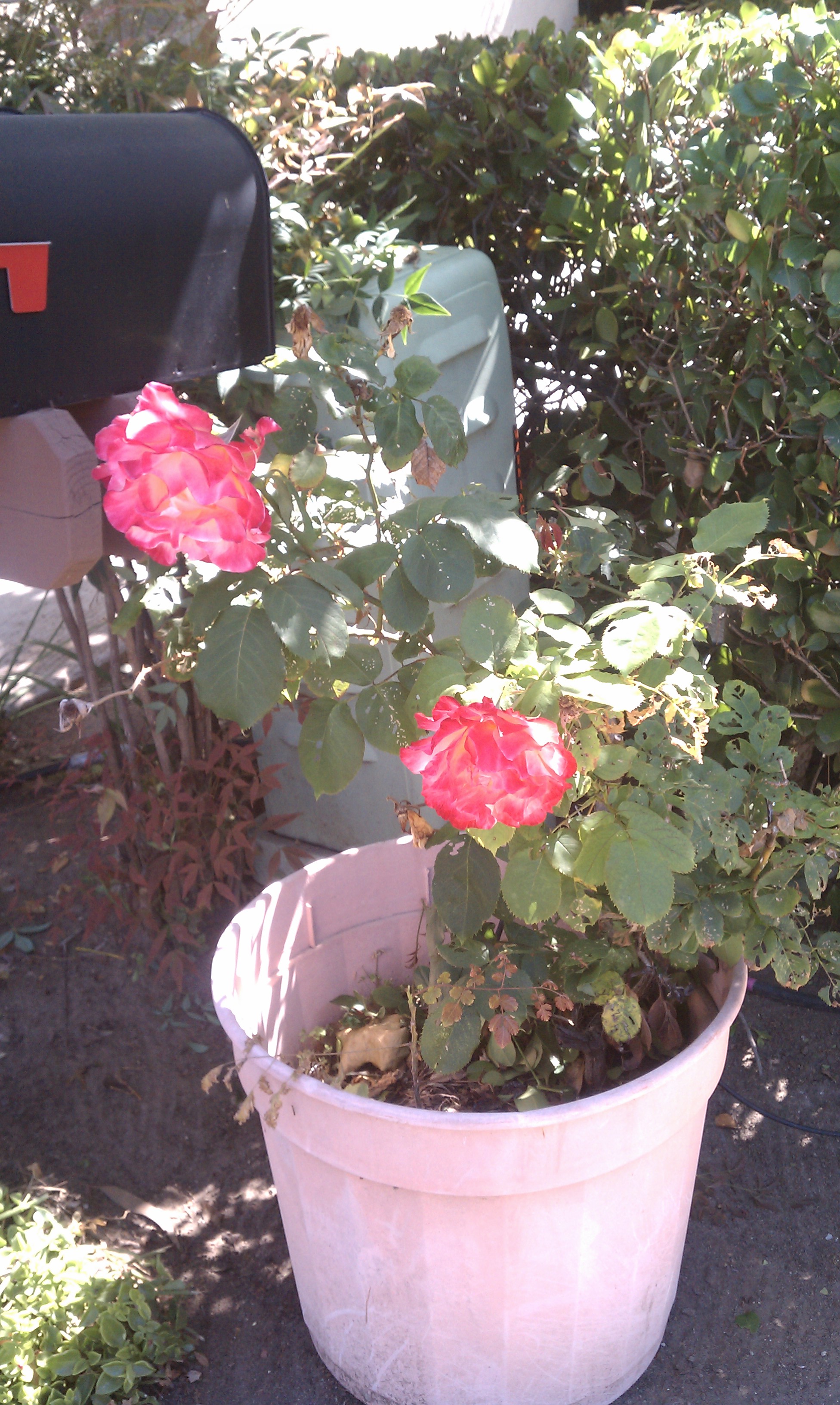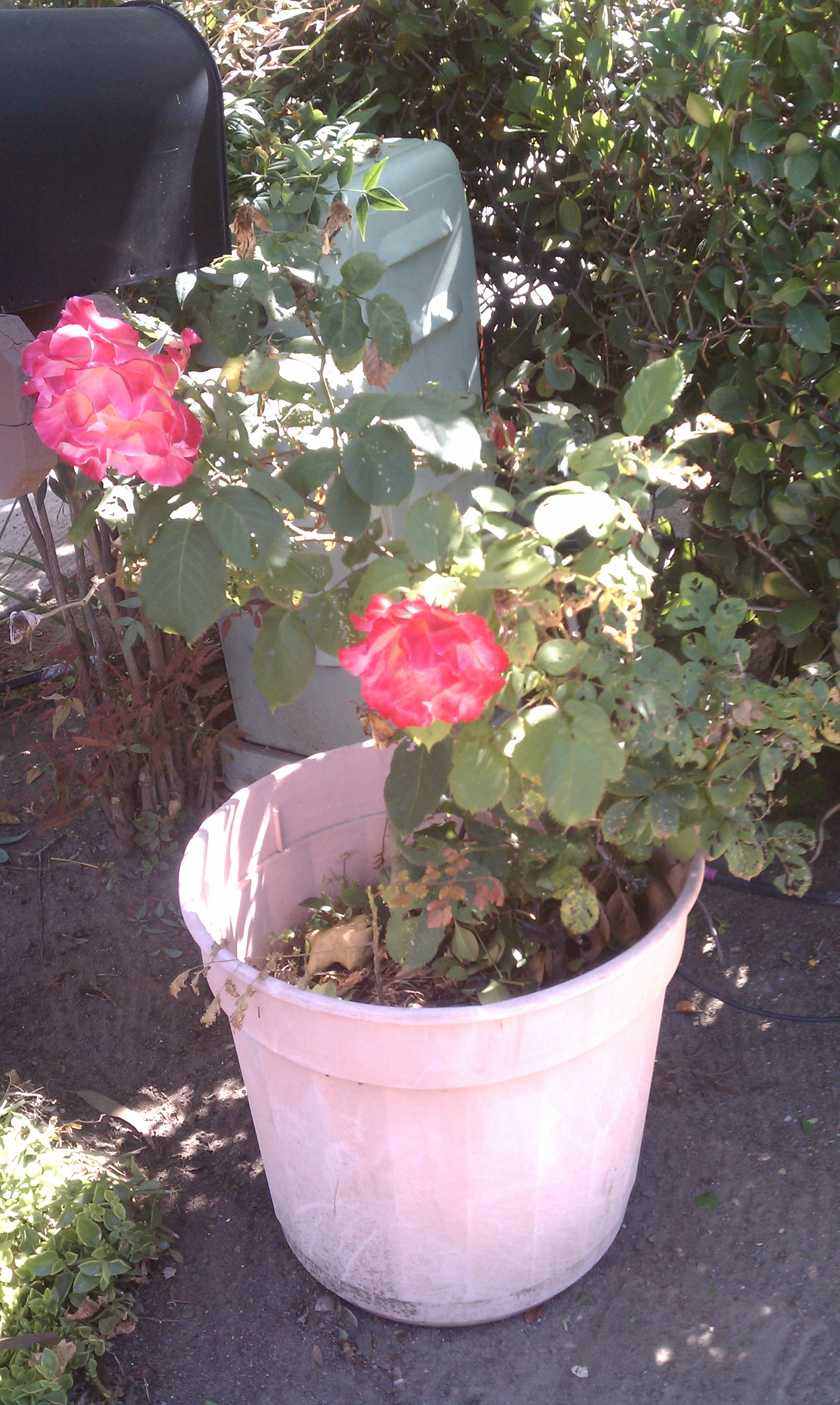 I never knew his name although he was my neighbor. I saw him every afternoon around four o’clock when I went by his condo, walking my Golden Retrievers, Melody and Rhythm. He would be standing by the plastic pot that held his rose bush, smoking a cigarette, and tending the rose. Usually he was tweaking the black irrigation tube that had been jerry-rigged from the main irrigation system to the pot. In the California desert, nothing grows that isn’t watered. So, he had to really love that rose because he had gone to so much trouble for it.